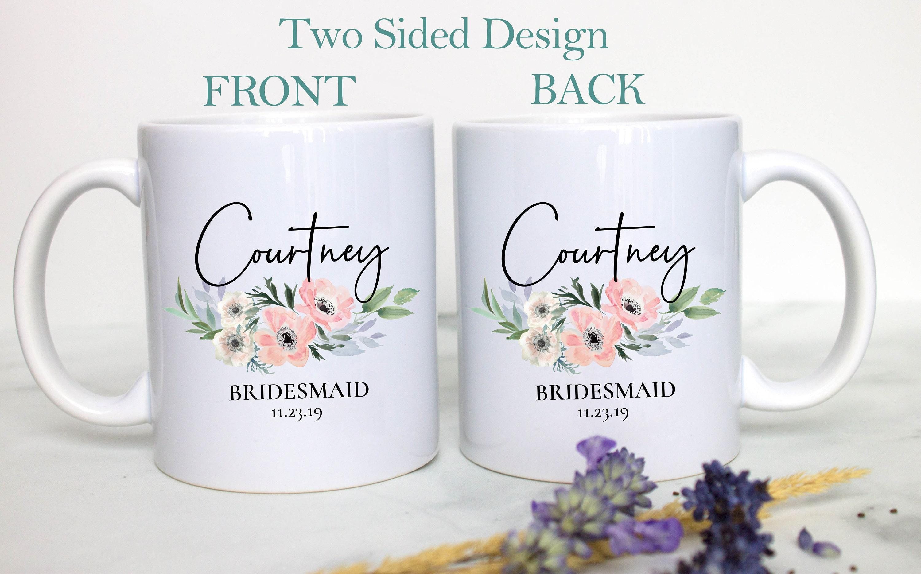 Pink Blush Floral Bridesmaid Custom Name and Date - White Ceramic Mug