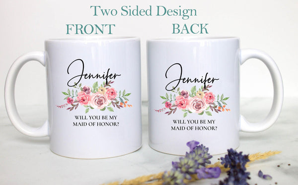 Pink Floral Bridesmaid Custom Name and Date - White Ceramic Mug
